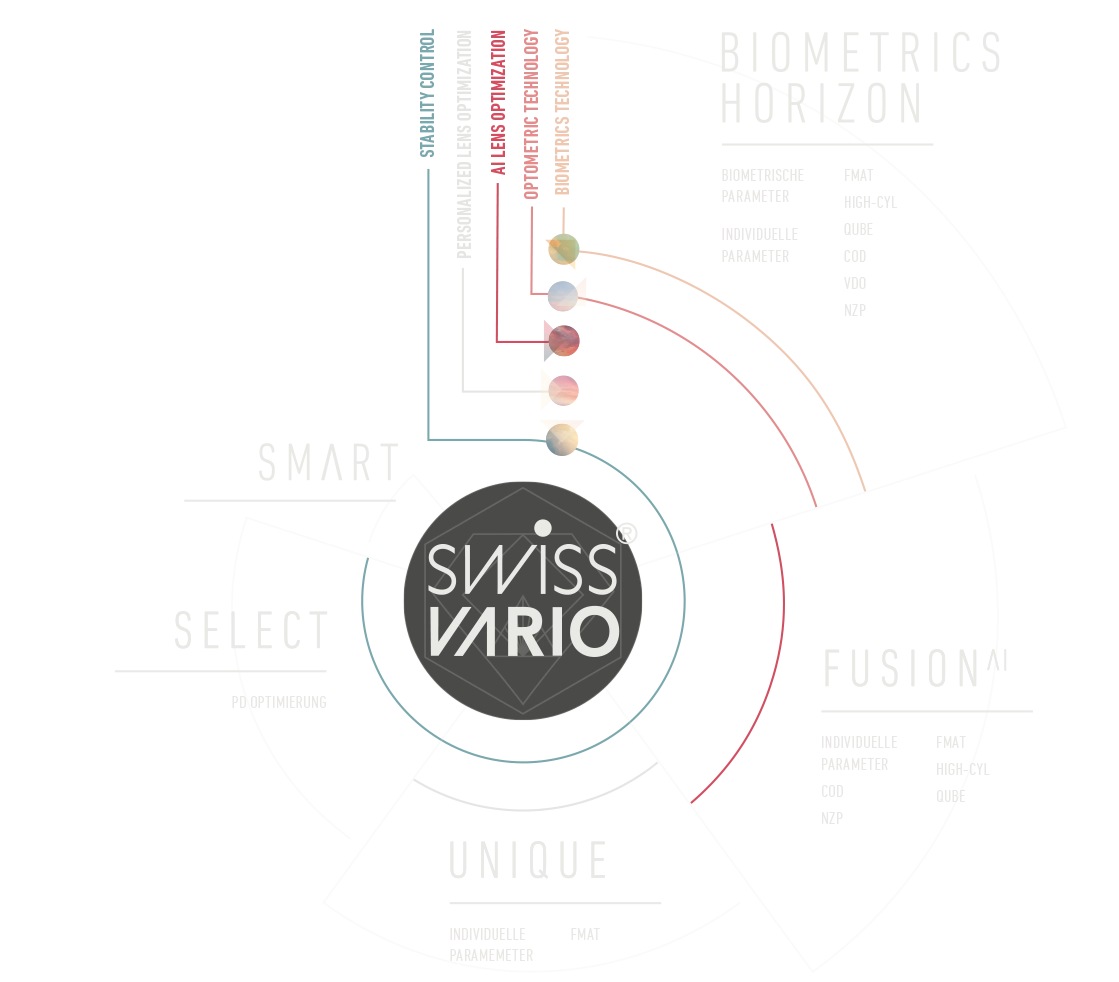 Mit jahrzehntelanger Expertise im High-End-Bereich individueller Gleitsichtgläser und in enger Zusammenarbeit mit Forschungspartnern wurde die SWISSVARIO Lens Architecture entwickelt. Sie vereint exklusive Features und digitale Optimierung, um allen Kundengruppen beste Lösungen zu bieten – mit exzellentem Spontankomfort und optimaler Sehleistung in jeder Situation.