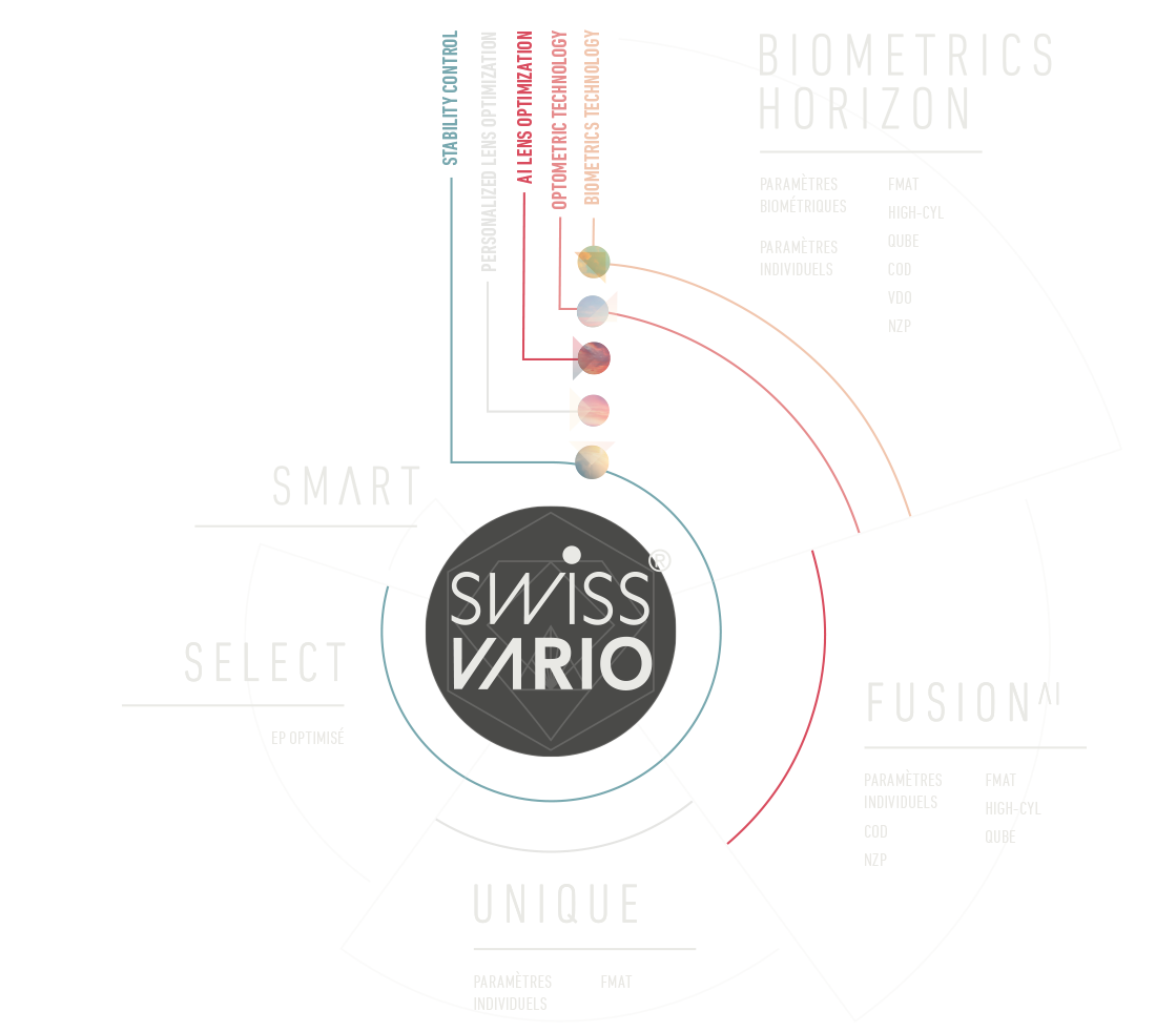 La gamme SWISSVARIO est structurée et cohérente. Cinq designs précisément définis, avec des bénéfices lisibles : de la qualité essentielle au verre optimisé par intelligence artificielle, jusqu’à la solution premium biométrique. Vous pouvez ainsi accompagner chaque porteur avec précision, des besoins les plus courants aux attentes les plus exigeantes.