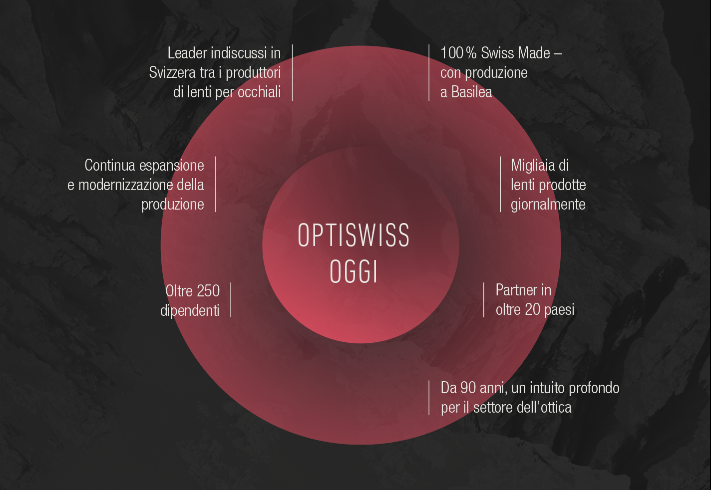 Nel tempo si è evoluta anche la struttura societaria. Ciò che è rimasto immutato è il nostro impegno per la qualità e la forza innovativa che ci contraddistinguono. La nostra ambizione è offrire all’ottica specializzata un partenariato alla pari, fondato su competenze, affidabilità e autentici elementi di unicità. In questo modo, Optiswiss si annovera tra i pochi produttori di lenti oftalmiche completamente indipendenti.